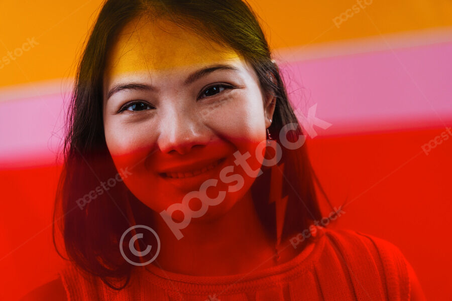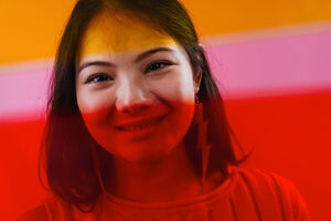Chinese woman smiling while standing behind yellow and red plastic sheets against pink background in studio