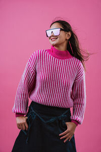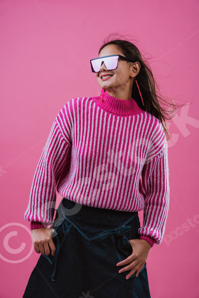 Chinese woman wearing pink striped sweater, bolt earrings, and sunglasses smiling and looking away standing with thumbs in pockets against pink background in studio