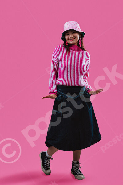 Chinese woman wearing orange knit sweater and checkered bucket hat smiling while standing with thumbs in her pockets against pink background in studio