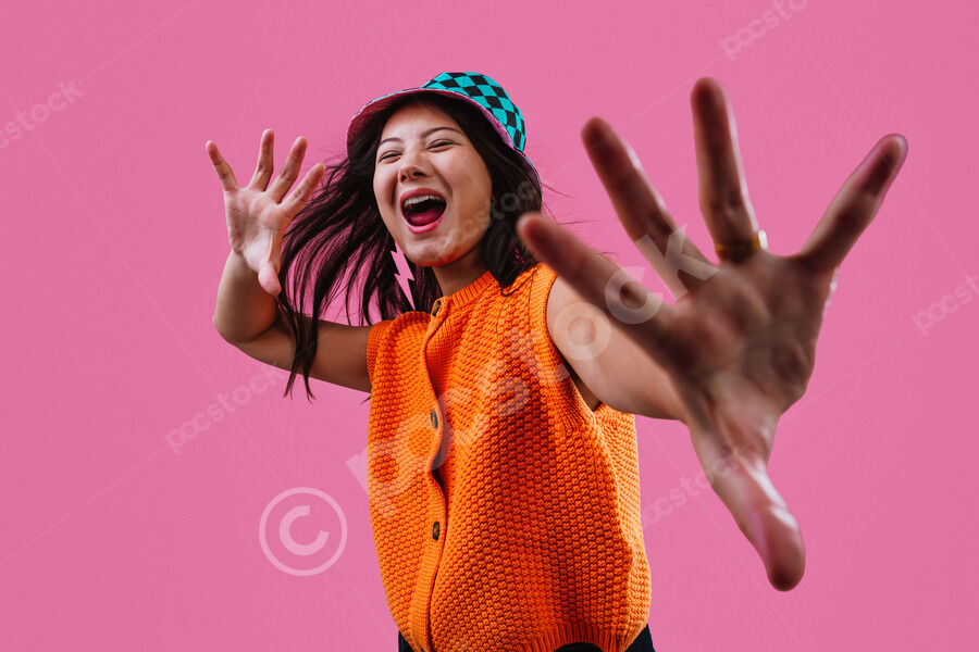 Cheerful Chinese woman wearing orange knit sweater and checkered bucket hat extending her hands forward and laughing while standing against pink background in studio
