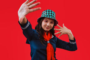 Chinese woman wearing Japanese-style school uniform and checkered bucket hat raising her hands and smiling while standing against red background in studio