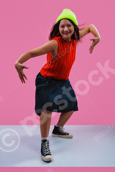 Chinese woman wearing red top holding her neon green beanie standing against pink background in studio
