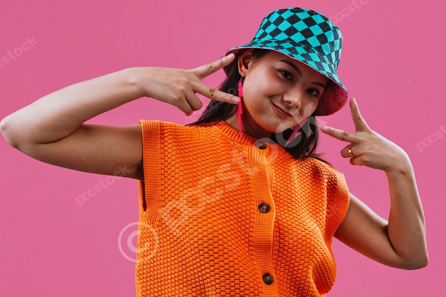 Chinese woman wearing orange knit sweater and checkered bucket hat showing peace signs and smiling while standing against pink background in studio