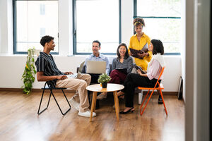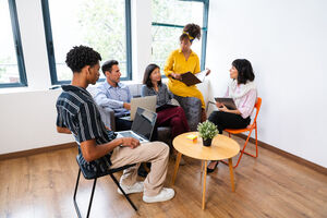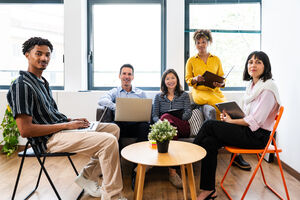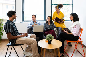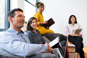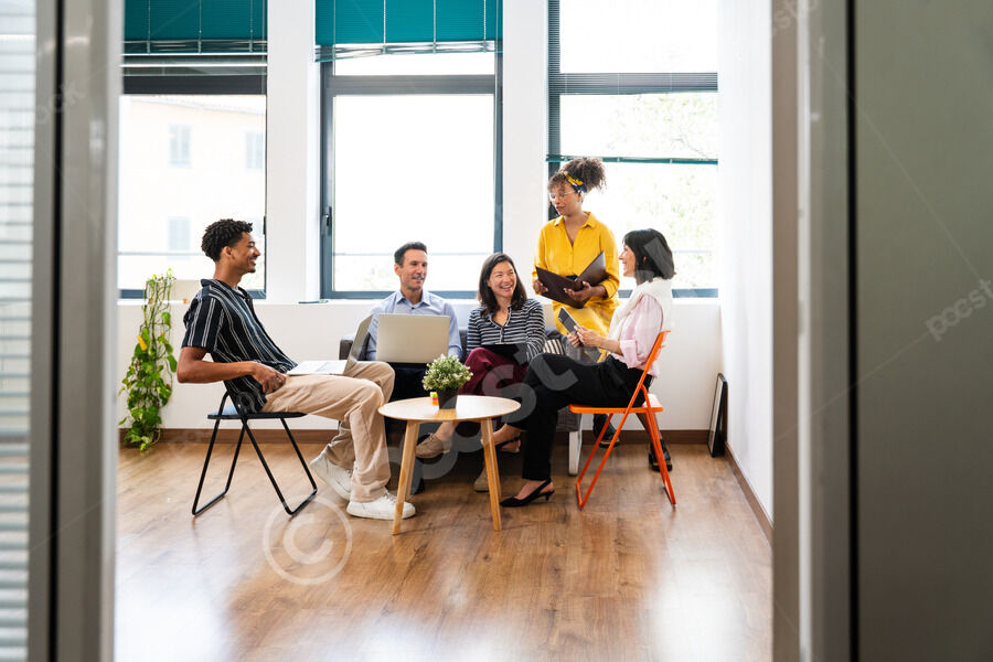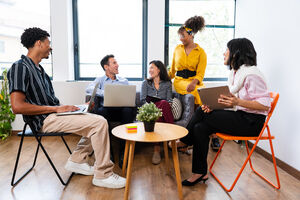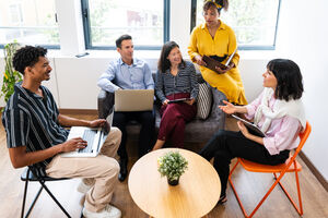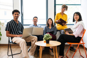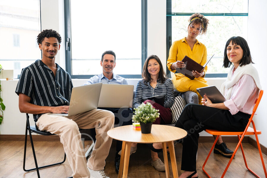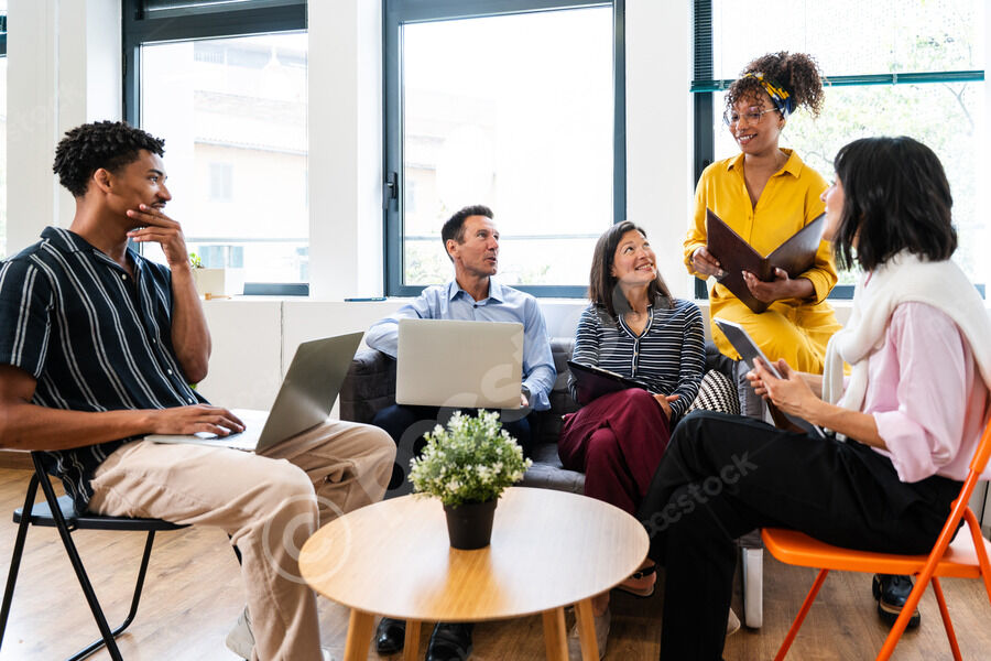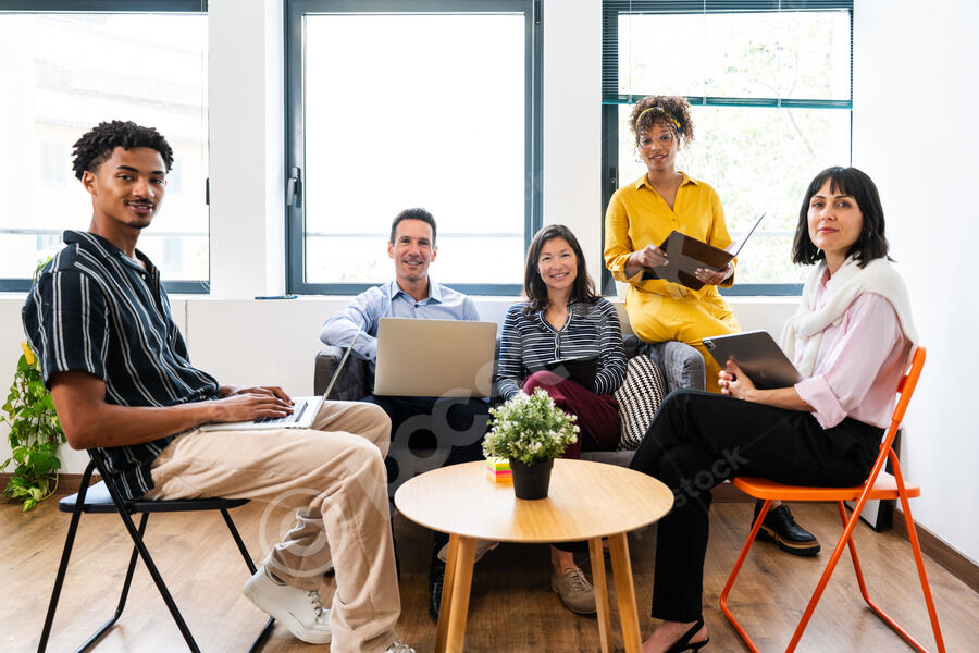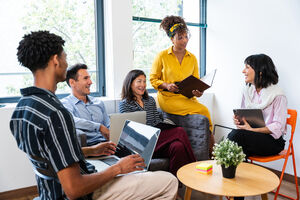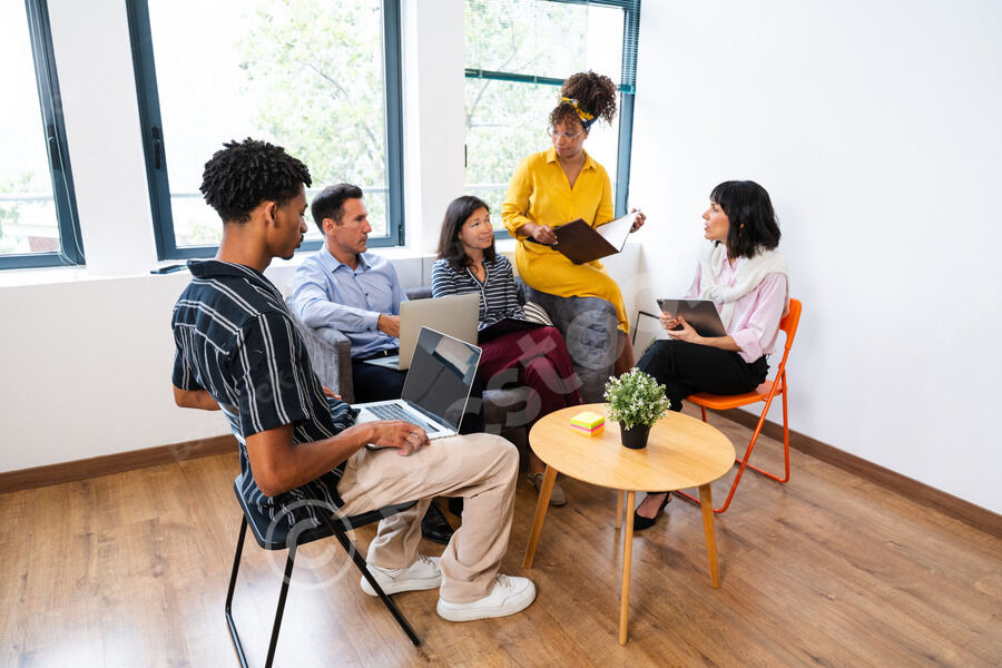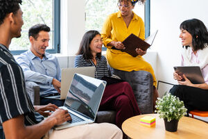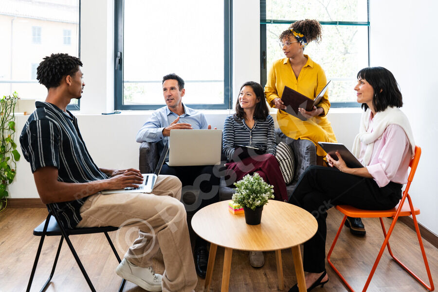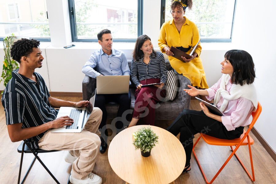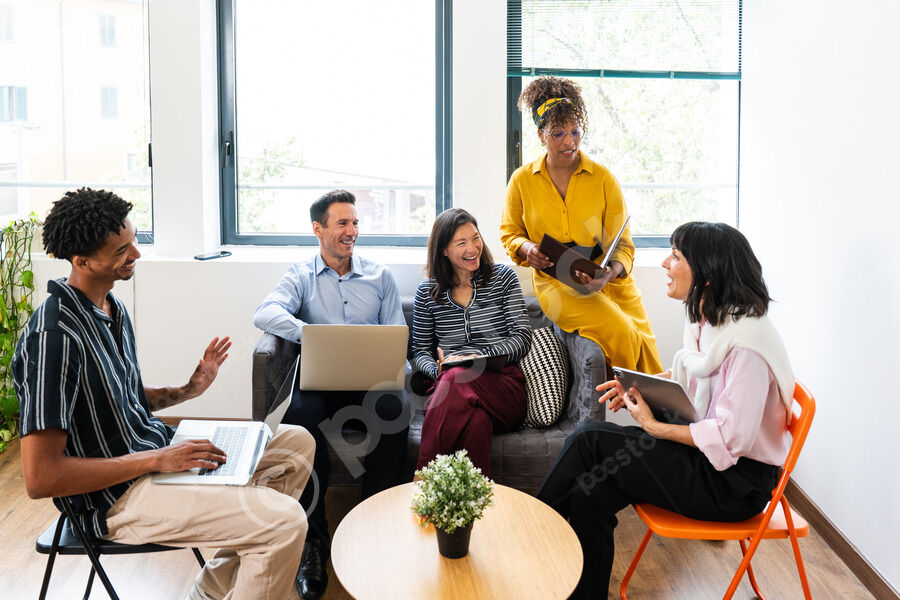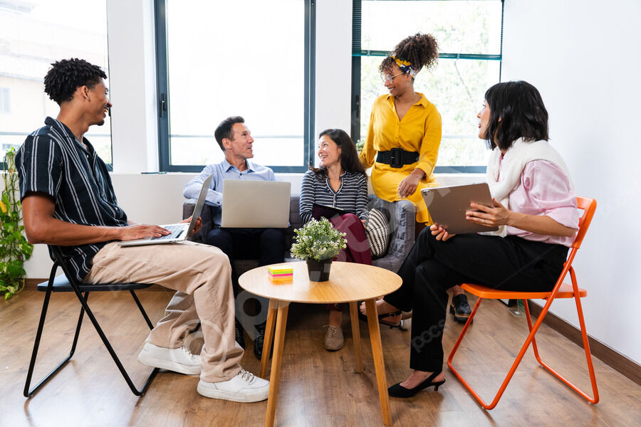 Diverse group of business people holding laptops, tablet, and clipboard discussing strategy and planning on a project while sitting on couch and chairs in office