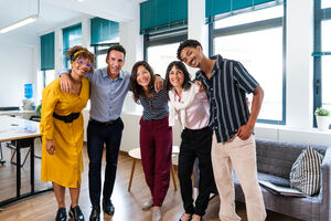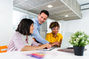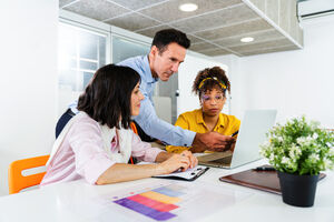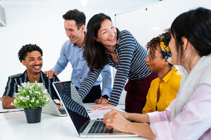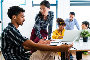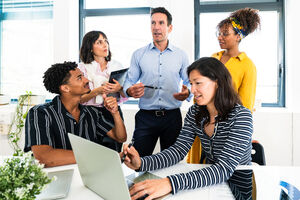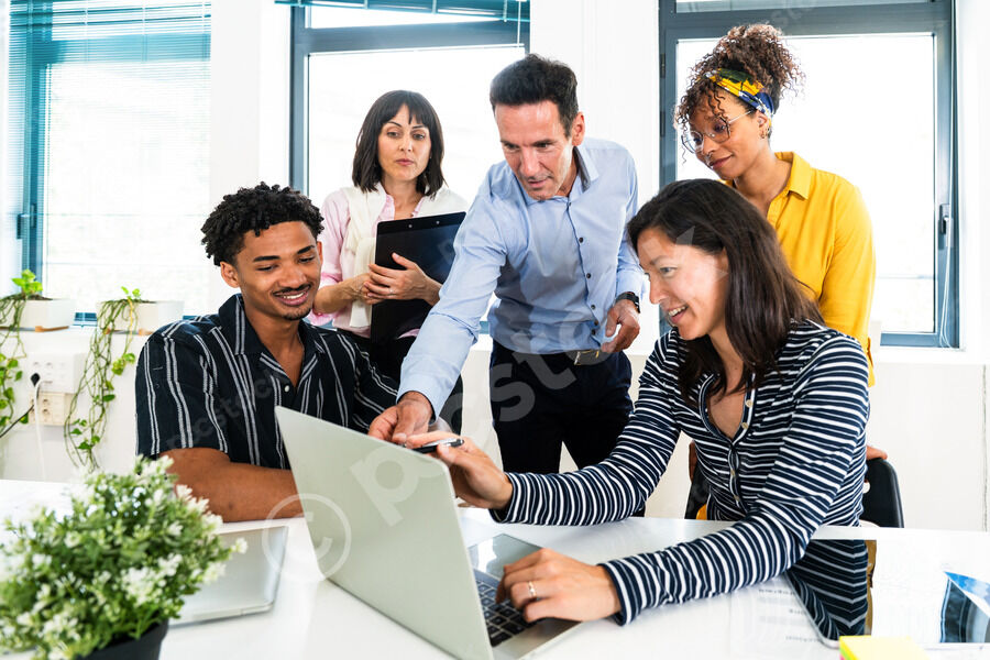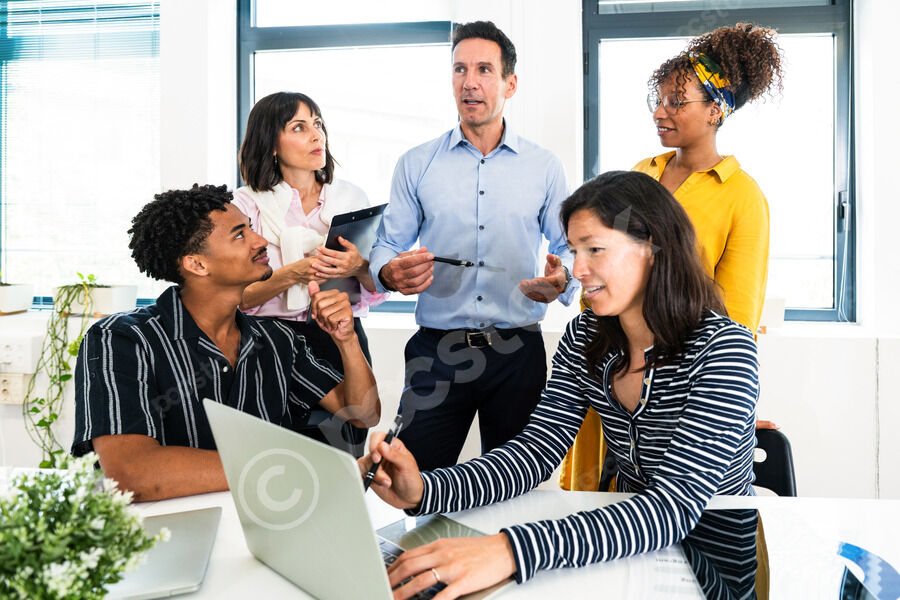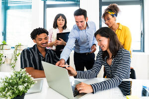 Diverse group of business people gathering around laptop collaborating on a project while sitting and standing in office