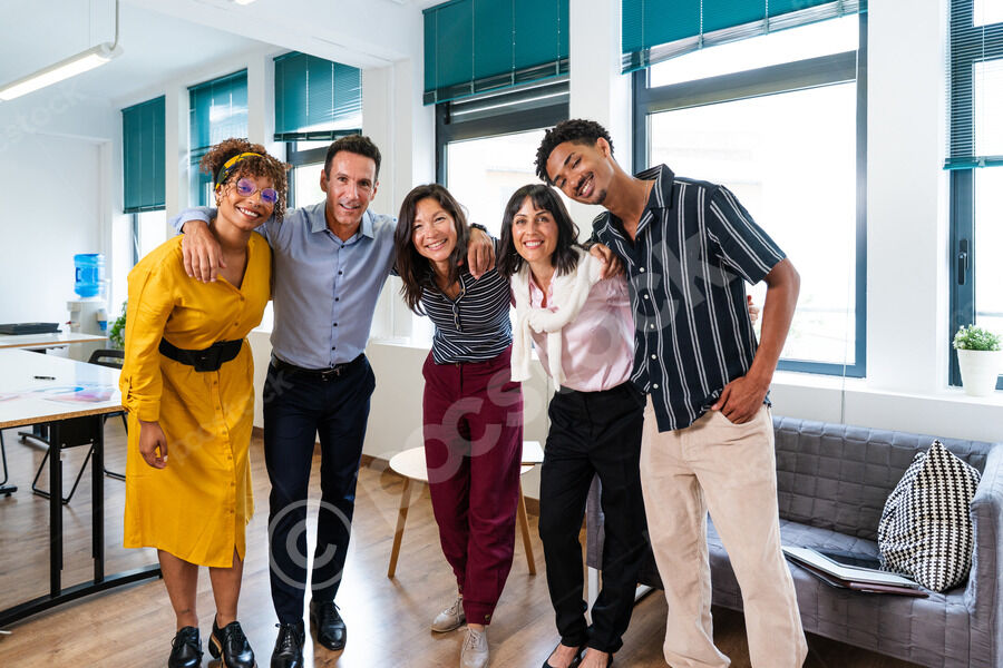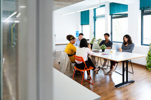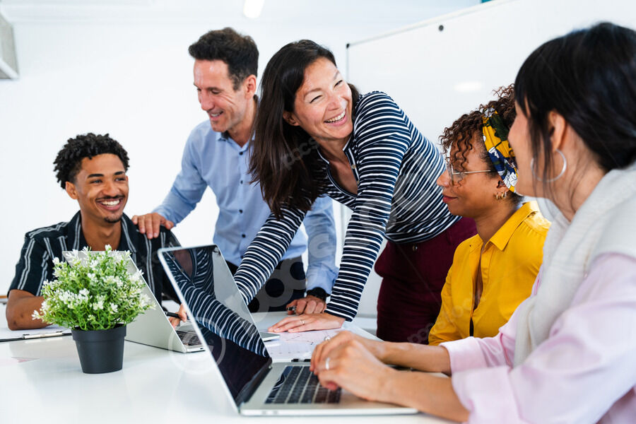 Diverse group of business people gathering around table with laptops and document collaborating on project in office