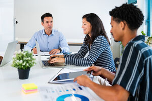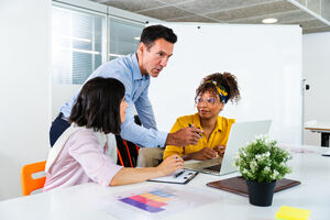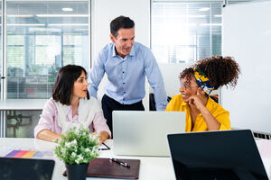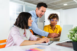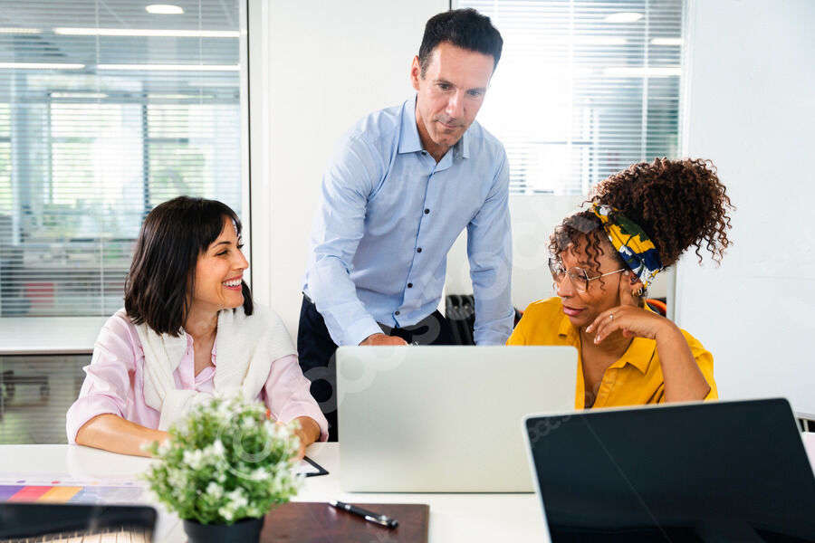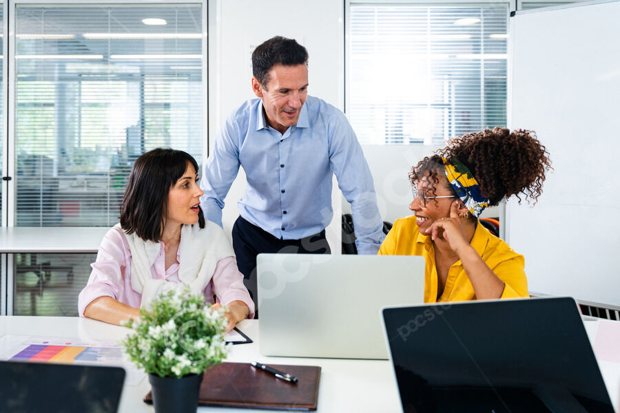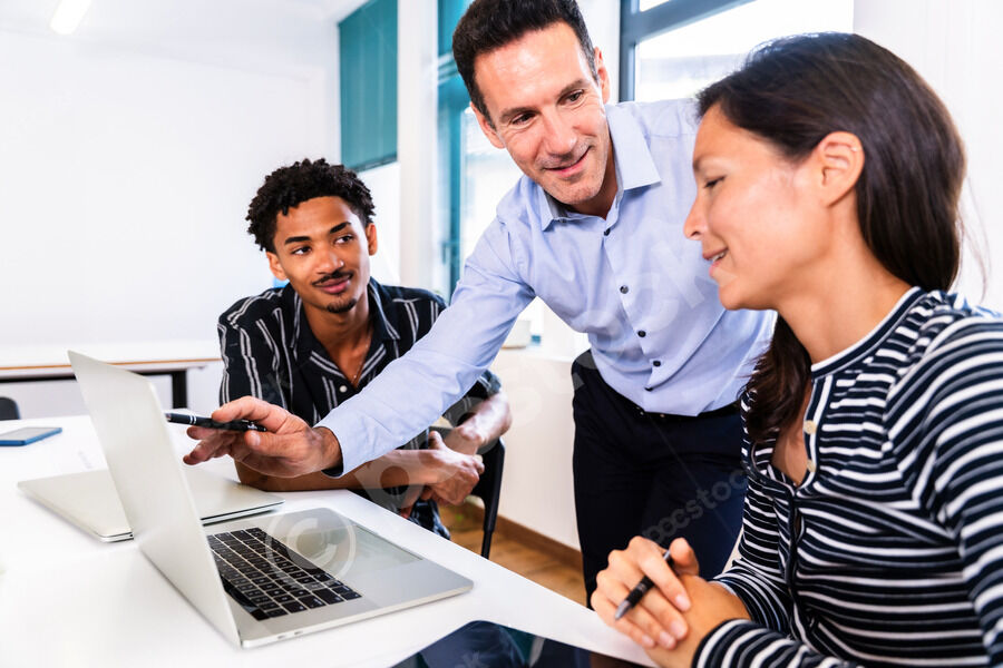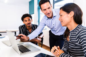 Hispanic man and Asian woman sitting at table and listening to caucasian male boss discussing project on laptop while standing and leaning forward in office