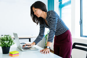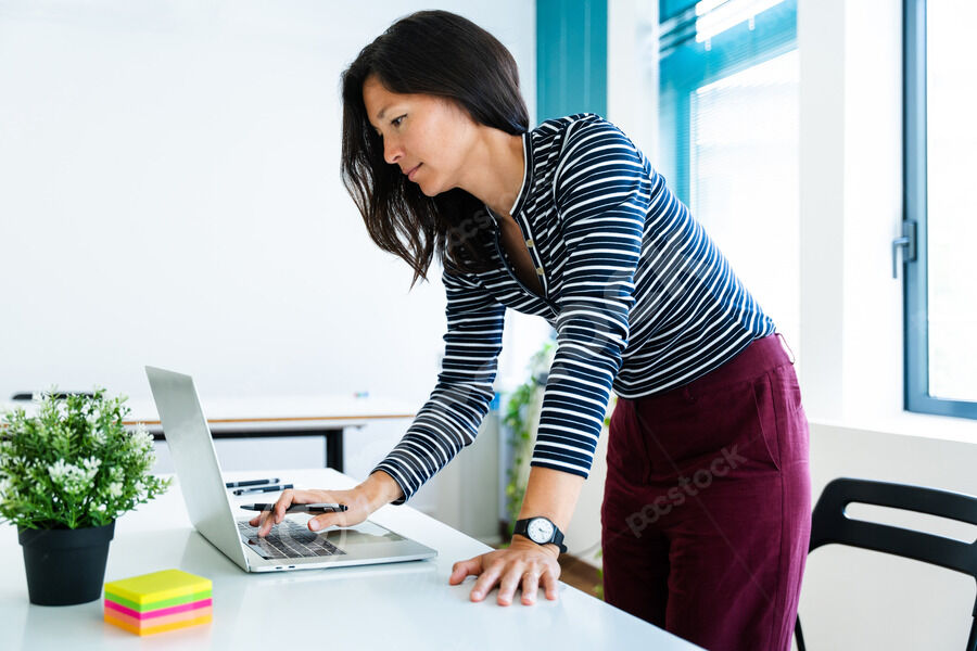 Asian business woman leaning forward on table and working on laptop while standing in office