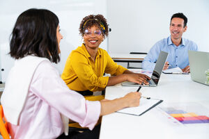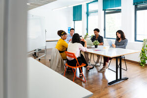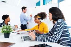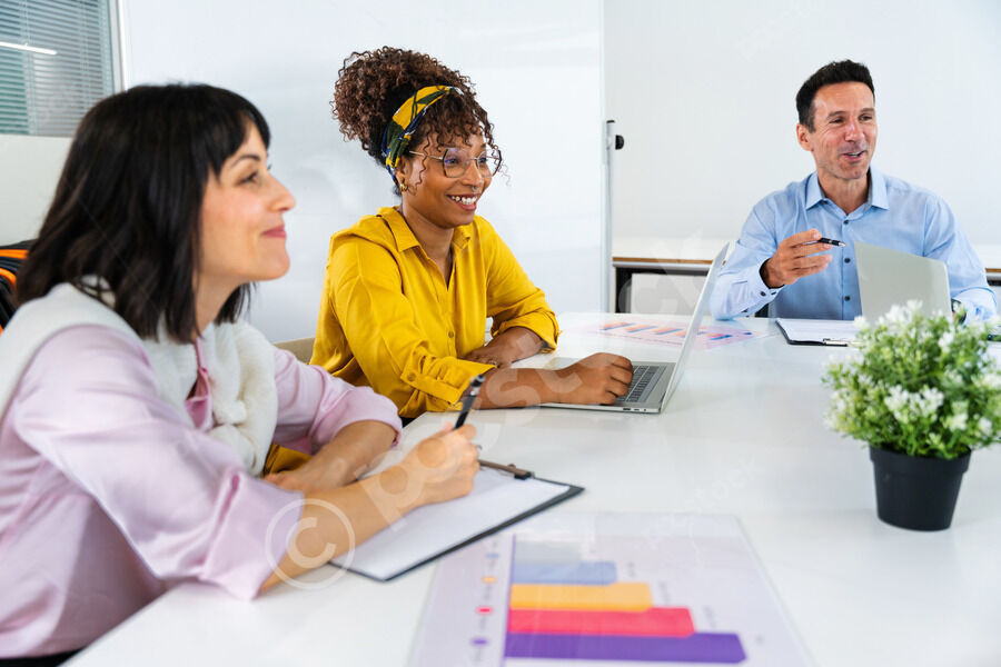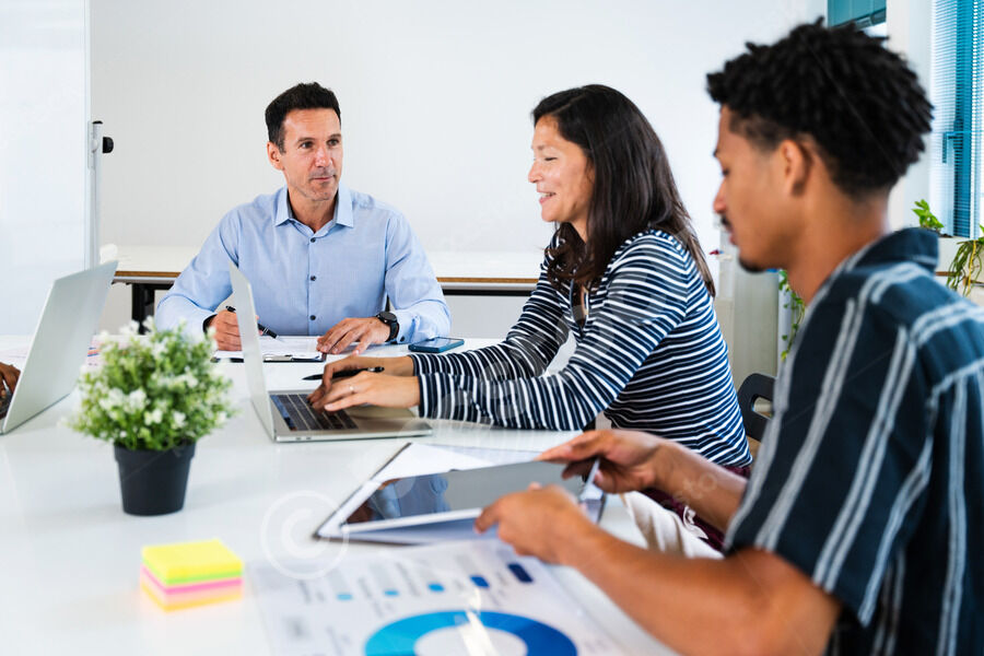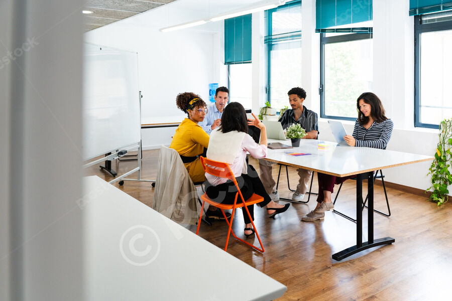 Diverse group of business people sitting at table and collaborating on project during corporate meeting in office