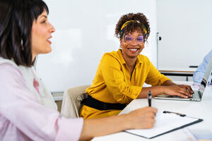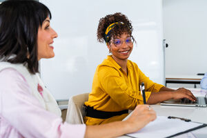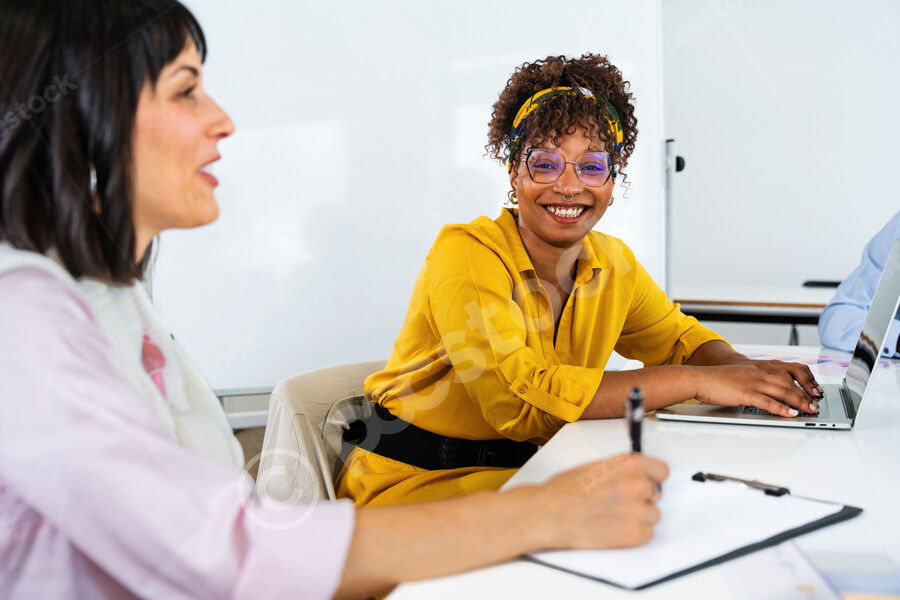 Hispanic and caucasian business women having a meeting sitting at table with clipboard and laptop in conference room in office