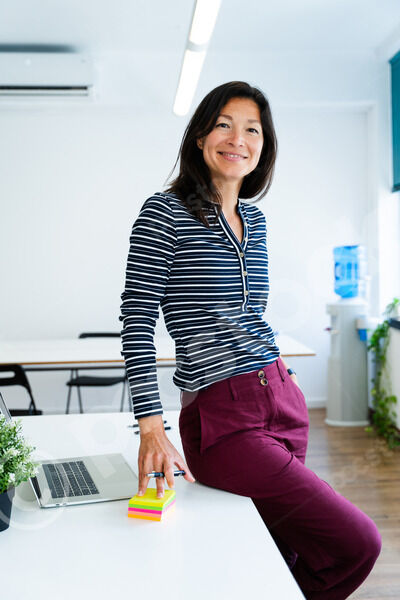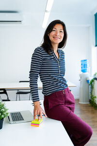 Asian business woman in striped shirt holding pen sitting on table with laptop and colorful sticky notes in office