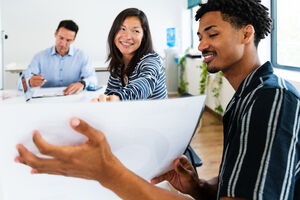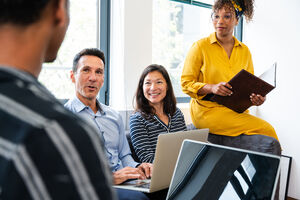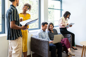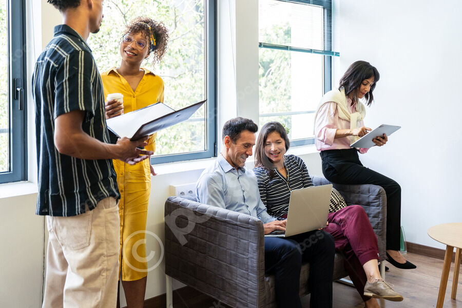 Diverse group of business people holding laptops, tablet, and clipboard discussing strategy and planning on a project while sitting on couch and standing in office