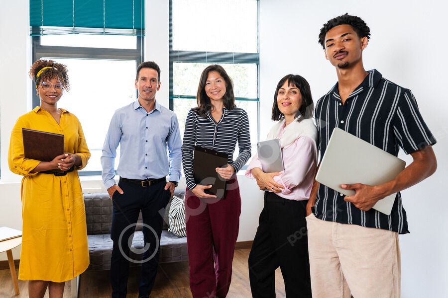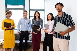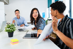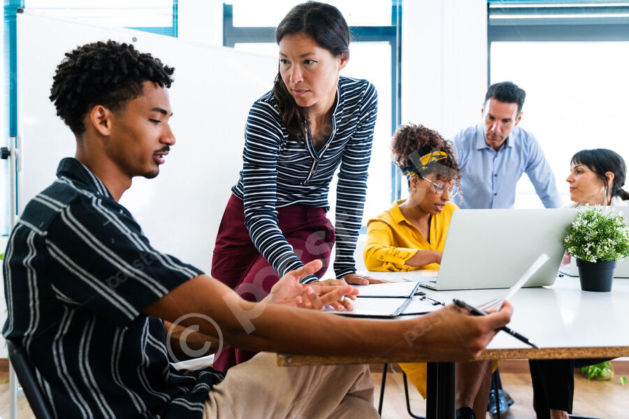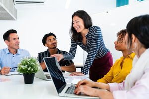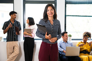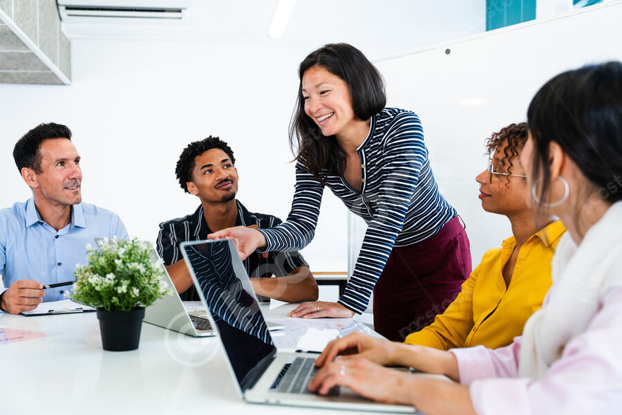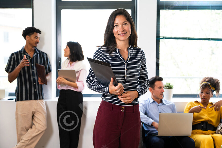 Diverse group of business people holding laptop, tablet, and folder discussing strategy and planning on a project behind Asian woman standing with clipboard in office