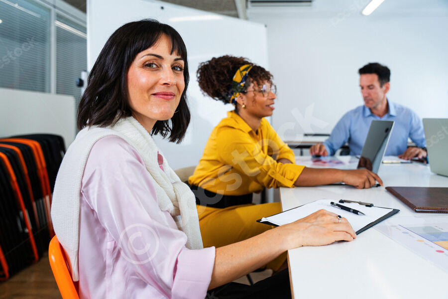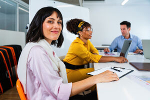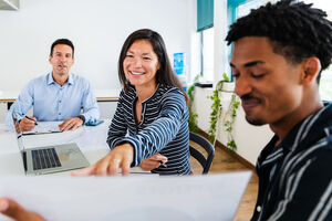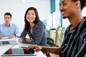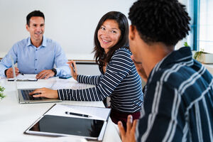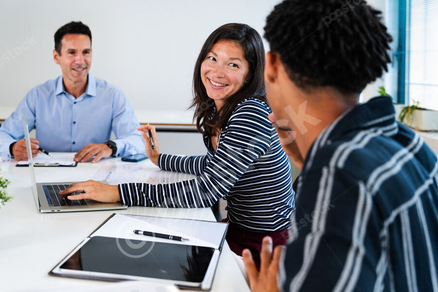 Smiling Asian business woman with Hispanic and caucasian male colleagues sitting at long table with tablet and laptop in conference room in office