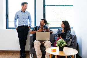 Hispanic man with laptop and Asian woman holding clipboard sitting on sofa and talking to caucasian male boss standing with hands in pockets in office
