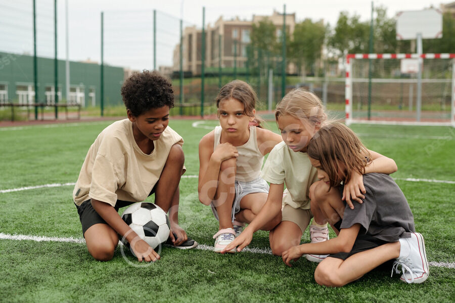 Black father having fun playing soccer with his son and daughter in the backyard on sunny day
