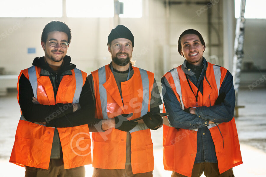 Mixed-race male workers wearing safety vests with arms crossed standing in warehouse