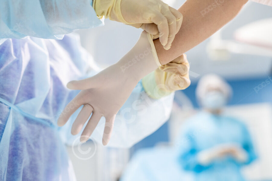 Cropped image of Mixed-race man's hands being cleansed by nurse with gauze and green solution during operating procedure in operating room