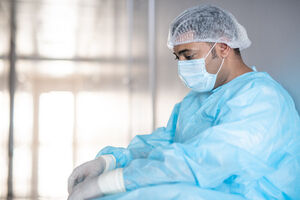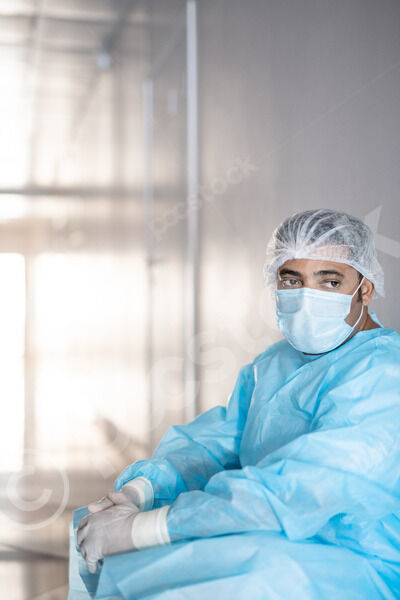 Middle Eastern male surgeon in protective gear standing with colleagues inside operating room