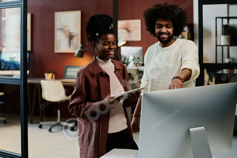 African American boy with his friend in apron decorating cookies with sprinkles standing at table in kitchen at home