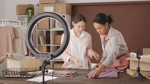 Mixed-race female video blogger showing clothes to mobile phone camera filming review for her channel while sitting at table with ring light in her home office