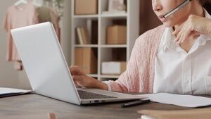 Mixed-race woman in headset talking with client on laptop and making notes while sitting at desk in office of online clothing store