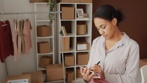 Mixed-race woman making notes on clipboard while standing in office of small delivery company