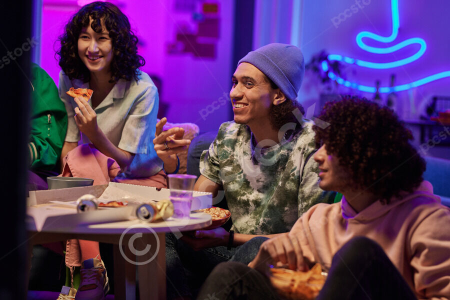 Group of men clinking with bottles of beer while sitting on sofa at home