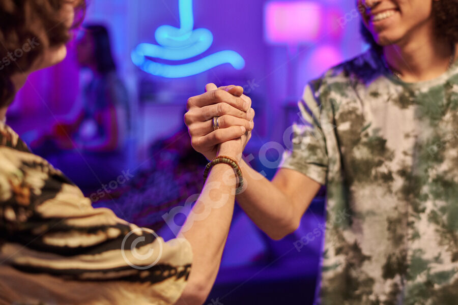 Mixed-race man raising hands watching hockey on TV with his male friends while sitting on sofa at home