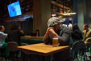 Mixed-race group of friends with caucasian male holding beer watching TV while sitting at home