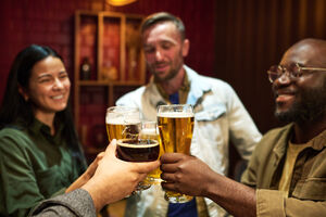 Hands of Mixed-race group of friends with caucasian male clinking bottles of beer while standing at party home