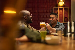 Mixed-race group of friends with caucasian male toasting beer bottles while sitting together at home