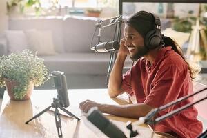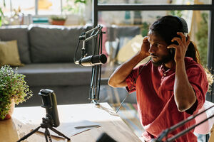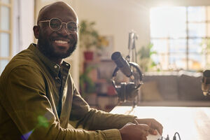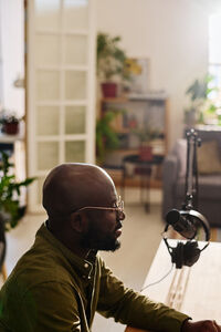 Black male podcaster with eyeglasses talking in microphone while sitting at table in home studio during daytime