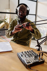 Black male podcaster in headphones and eyeglasses adjusting microphone while sitting at table in home studio