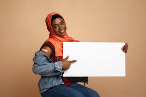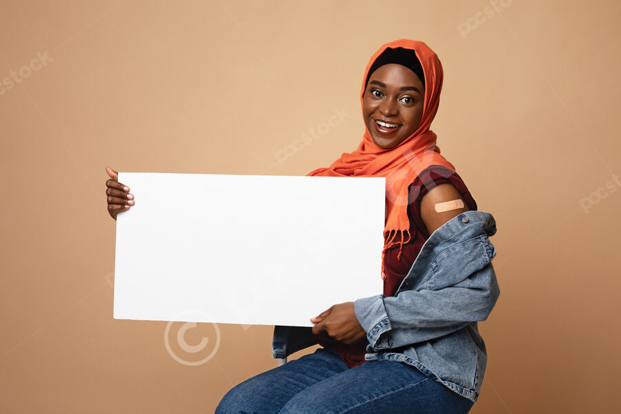 Black woman with plaster on arm holding blank placard sitting against beige background in studio