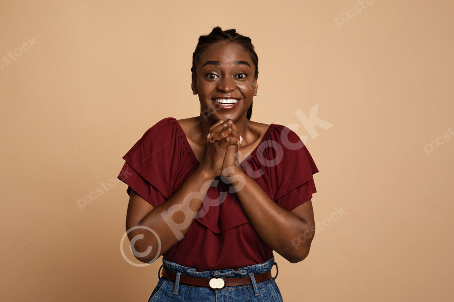 Excited Black woman with clasped hands under her chin standing against beige background in studio