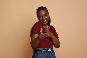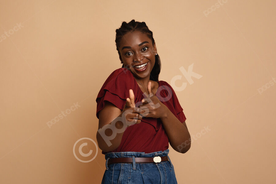 Black woman with hands near chest pointing fingers forward standing against beige background in studio