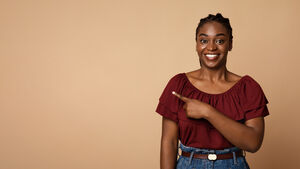 Black woman pointing sideways with both hands standing against beige background in studio