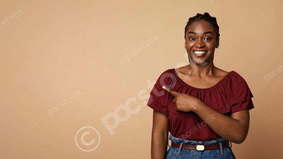 Black woman pointing finger sideways standing against beige background in studio