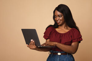 Black woman looking sideways holding tablet standing against beige background in studio