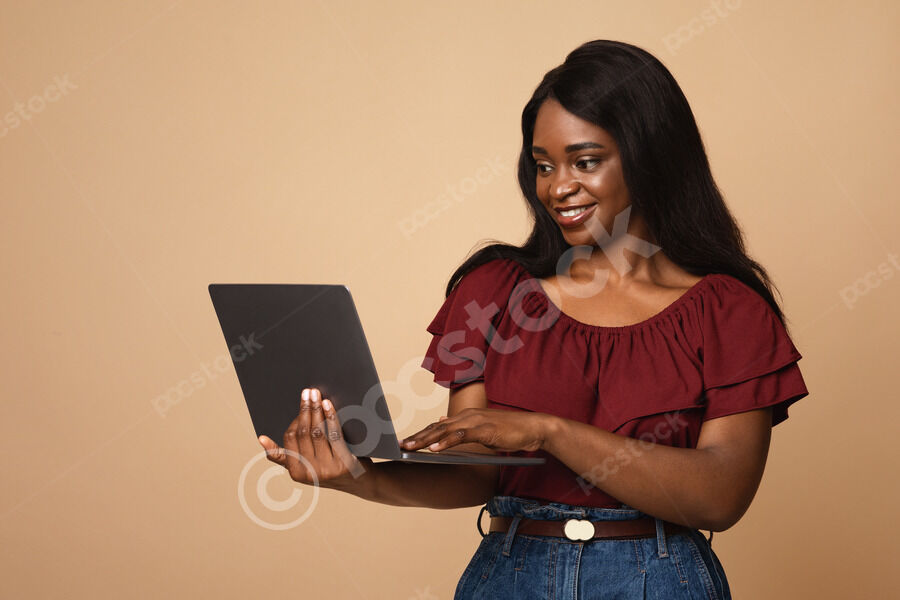 Excited Black woman celebrating success looking at laptop on her hand while standing against beige background in studio