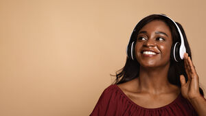 Black woman looking up listening music with headphones standing against beige background in studio