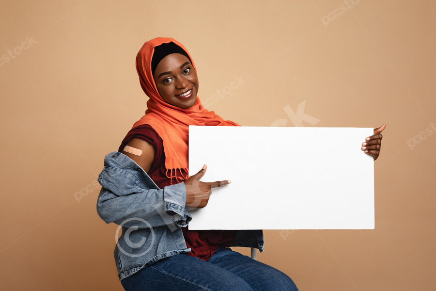Black woman with headscarf pointing at blank placard sitting on chair against beige background in studio
