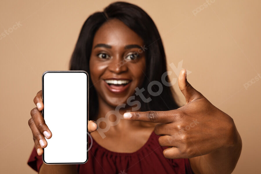 Black woman pointing at white-screened smartphone on her hand standing against beige background in studio