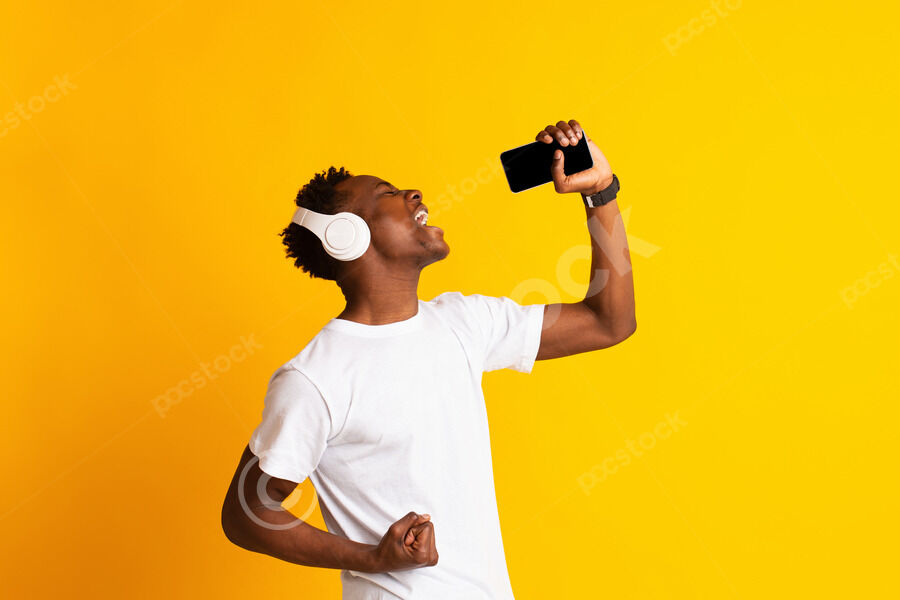 Asian female teenager showing mobile phone while standing beside huge smartphone against yellow background in studio