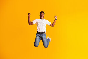 Cheerful Asian female teenager with open arms standing against yellow background in studio