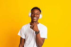 Smiling Asian female teenager in yellow shirt standing against blue background in studio