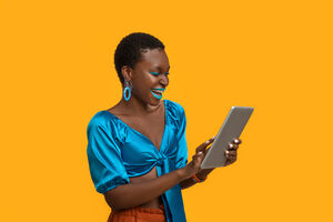 Smiling Black woman with short hair browsing on tablet while standing against yellow background in studio