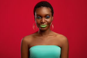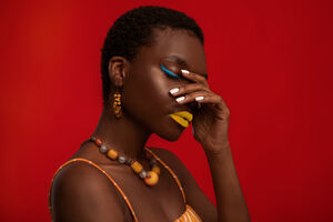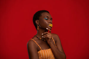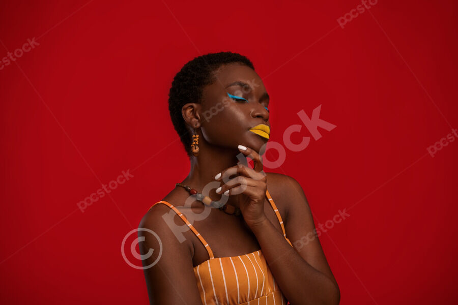 Black woman with short hair touching her chin standing with closed eyes in front of red background in studio