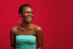 Smiling Black woman with short hair looking sideways while standing against red background in studio
